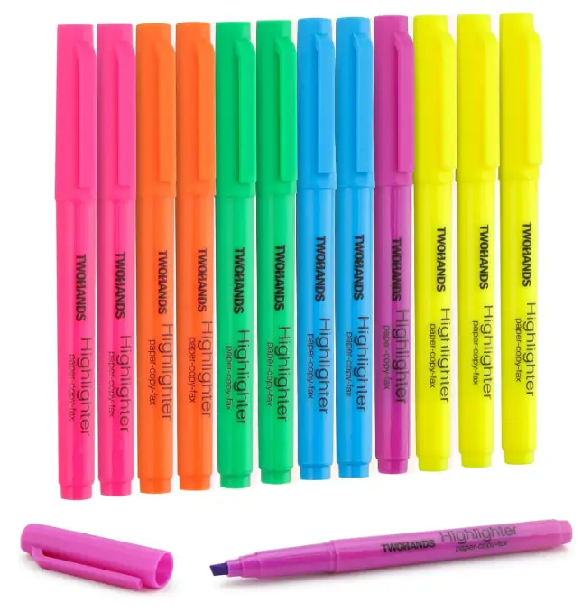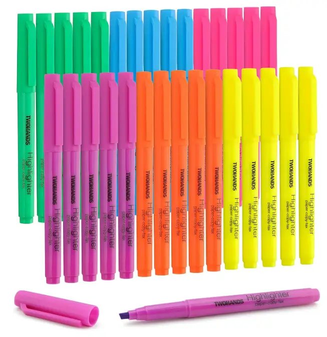 TWOHANDS Assorted Color Highlighters pack of 30 is ideal for classrooms, offices, and group study, offering plenty of markers for everyday use. The durable chisel tips allow both broad highlighting and precise underlining, while quick-drying ink helps prevent smudging on notes and documents. Smooth, reliable ink flow highlights text clearly without excessive bleed-through, making them practical for high-volume highlighting